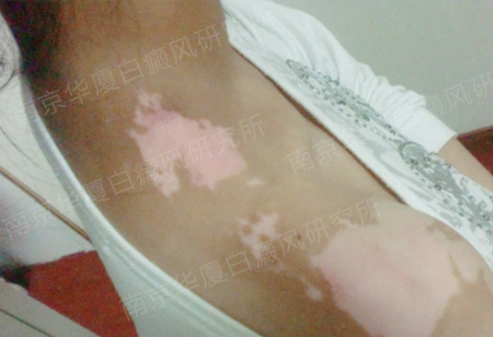 今年3月的一天,照镜子发现自己的颈部有块状白色斑点,后来,她就去小诊所,拿了点药擦擦,后来也就没有怎么管过,等到第二次去时,没想到白斑的范围越来越大了,这下可急坏了她,后来到南京医院检测被确诊为是白癜风....[我想了解此病例详情]